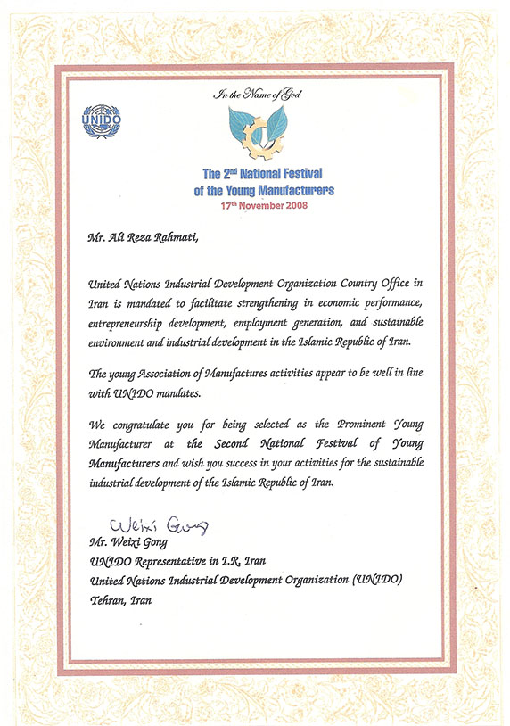 پنجمین جشنواره ملی مدیران و تولید کنندگان جوان چهارمین جشنواره ملی مدیران و تولید کنندگان جوان مدیر نمونه کشوری مدیر منتخب UNIDO (سازمان توسعه صنعتی ملل متحد) مدیر نمونه صنعت ساختمان تولیدکننده نمونه سازمان استاندارد بزرگداشت روز مهندس تدریس مبانی نظارت بر اجرای سقف ها صنعتگر نمونه حوزه ساختمان مدیر کنترل کیفیت نمونه کشور در صنعت ساختمان مدیر نمونه جوان در کشور مدیر کنترل کیفیت نمونه استان تهران در صنعت ساختمان